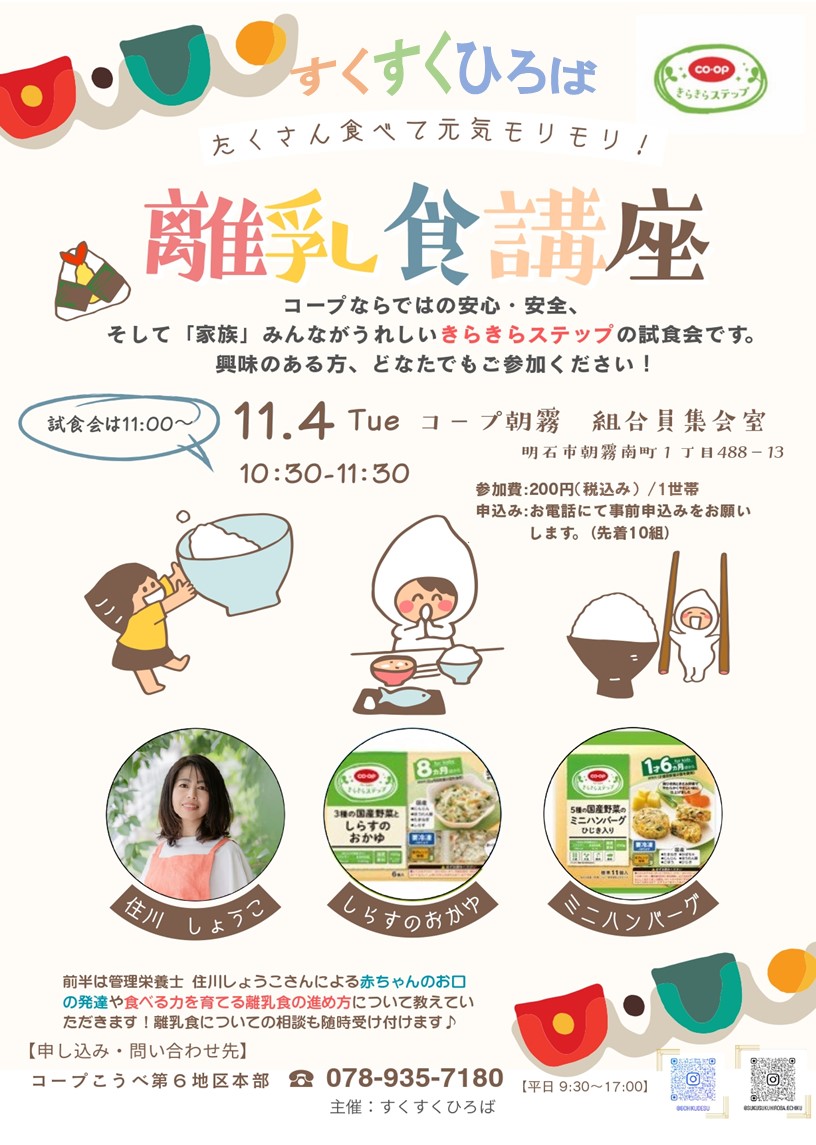 11月4日(火)コープ朝霧 子育てひろば「すくすくひろば」にて、コープの離乳食「きらきらステップ」の試食会を開催します♪