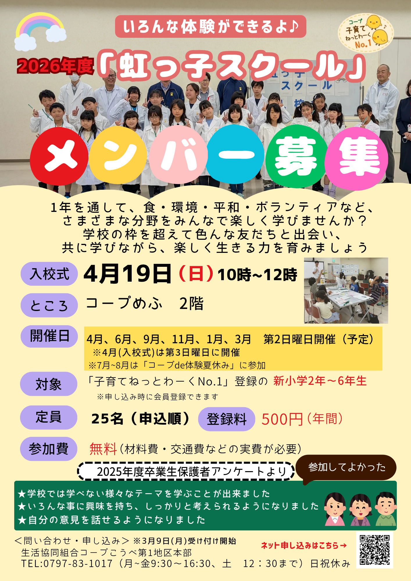 「虹っ子スクール」では一年を通して食や環境、平和、ボランティアなどさまざまな分野について、学校とは別の仲間と一緒に学びます。新しい体験や施設見学を通して、"生きる力"を育みませんか。2017年度からこれまでにのべ200人を超える小学生たちが参加しました☆