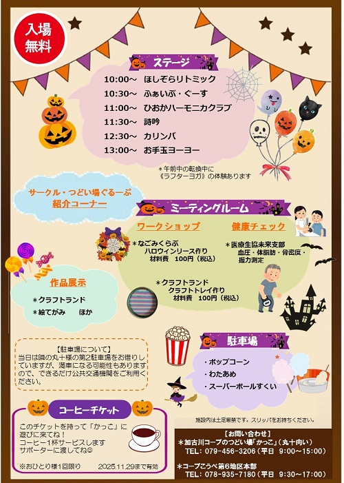 加古川コープのつどい場「かっこ」で活動するサークルやコープ委員が「かっこまつり」を開催します! コープ商品の試食や販売、健康チェック、ハーモニカなどのステージ演奏、ハロウィーンにちなんだワークショップなどを行います。 屋外ではポップコーン、スーパーボールすくいなどのブースも♪ スタンプラリーでプレゼントがもらえるなど、子どもから大人まで楽しめるイベントです!