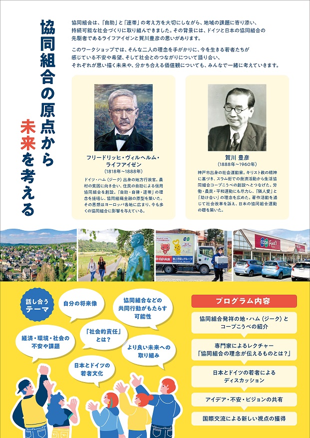 国連が定めた「2025年 国際協同組合年」にあわせて、ドイツと日本をオンラインで結び、ハイブリッド形式の国際交流会を開催します。 ドイツ・ラインラント=プファルツ州ハム(ジーク)とコープこうべ協同学苑(三木市)をつなぎ、両地域の若者が協同組合の理念を手がかりに、これからの社会のあり方について語り合います。海外の方とお話してみたい、協同組合という組織に興味のある方は是非、ご応募お待ちしています。