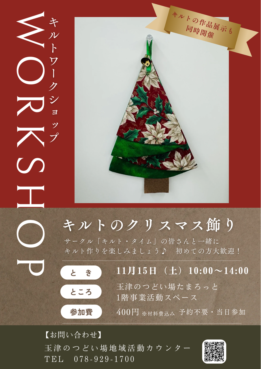 サークル「キルト・タイム」の皆さんと一緒に キルト作りを楽しみましょう♪ 初めての方大歓迎! 当日は、キルトの作品展示も同時開催いたします。 と き:11月15日(土)10:00~14:00 ところ:玉津のつどい場たまろっと1階事業活動スペース 内 容:キルトのクリスマス飾りを作ります 参加費:400円(材料費込み) 予約不要・当日参加