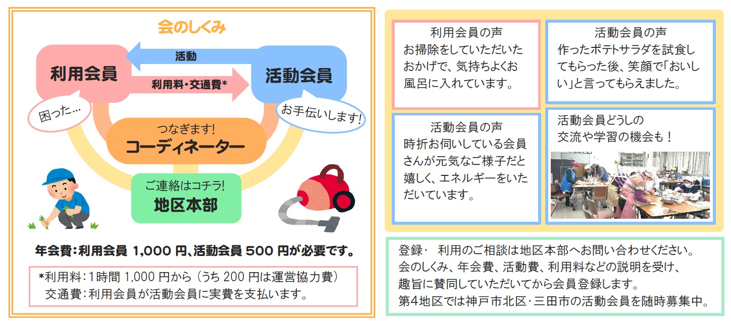 地域のみんなで助け合い、自立したくらしを支える有償の家事支援活動です。