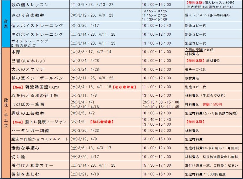 3月~4月は定期利用の講座が、体験レッスン1回1,000円または無料で